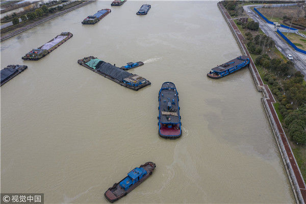 2018年12月27日,江蘇淮安,航拍京杭大運(yùn)河淮安段冬日景色。吳揚(yáng)/視覺(jué)中國(guó)