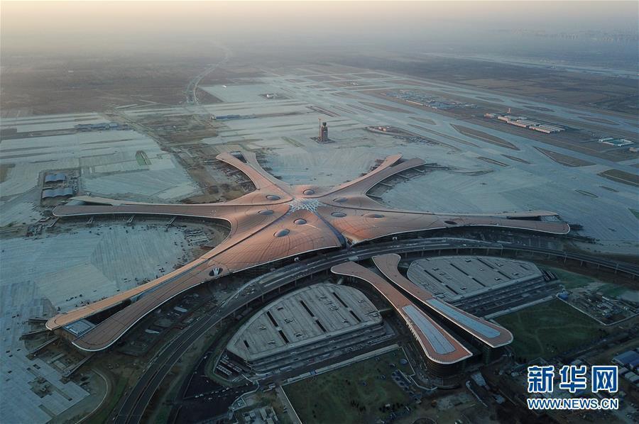 12月29日拍攝的北京大興國(guó)際機(jī)場(chǎng)(無人機(jī)拍攝)。 當(dāng)日,在北京大興國(guó)際機(jī)場(chǎng),隨著清晨第一縷陽(yáng)光灑在航站樓古銅色的屋頂上,寓意“鳳凰展翅”的航站樓呈現(xiàn)出金光燦燦的景象。 新華社記者 鞠煥宗 攝 圖片來源:新華網(wǎng)