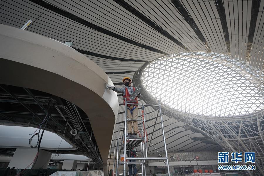 在北京大興國際機場主航站樓內,施工人員在進行裝飾裝修工作。新華社記者 鞠煥宗 攝 圖片來源:新華網(wǎng)