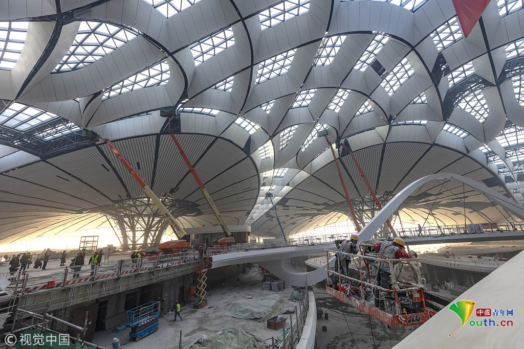 2018年12月19日,北京大興國際機場航站樓的室內(nèi)裝修在有條不紊的推進中。視覺中國
