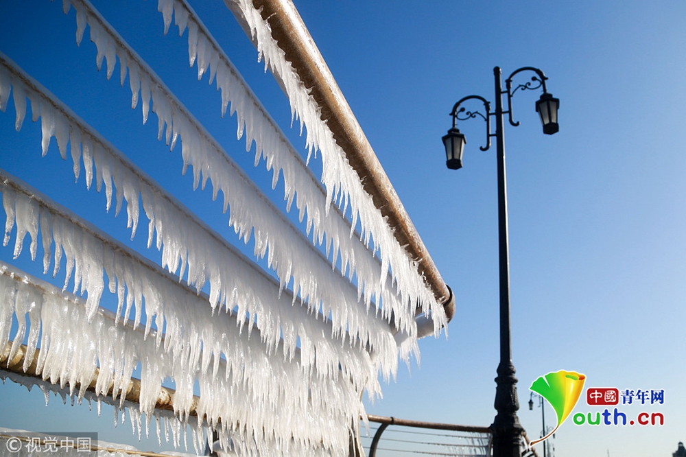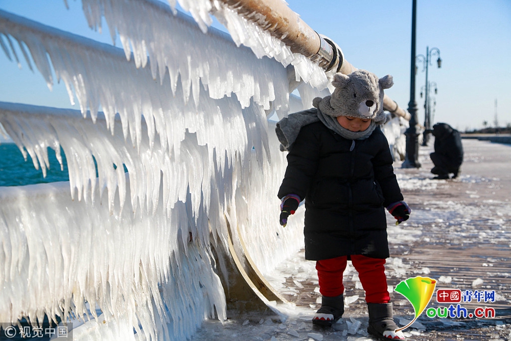 2018年12月29日,大連市迎來入冬以來最冷-12℃的低溫,在大風(fēng)和潮汐的作用下,海水在岸邊的護欄上瞬間凝固,凝結(jié)并形成大面積形狀各異的冰凌,在延綿5公里的木棧道上形成奇特的冰凌奇觀。