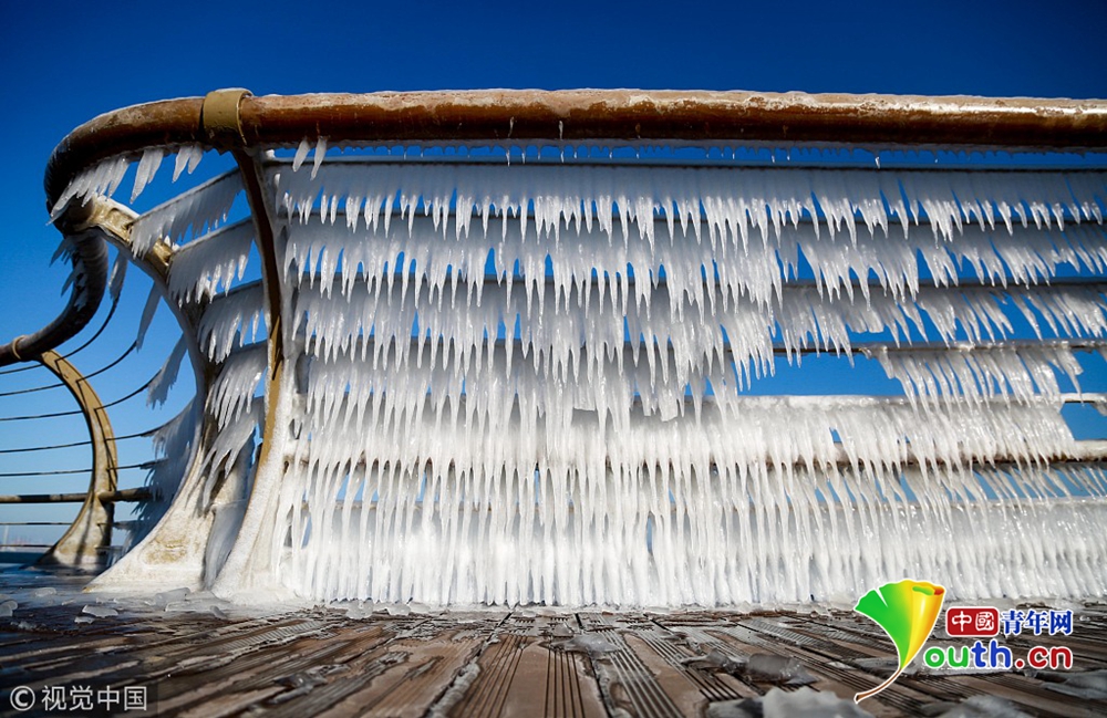 渤海海水在北風(fēng)的作用下涌向岸邊,在大連東港海岸護欄上凝結(jié)成冰凌,形成約有兩公里的冰凌奇觀。圖為大連市東港海岸護欄結(jié)滿晶瑩剔透的冰棱。圖片來源:視覺中國