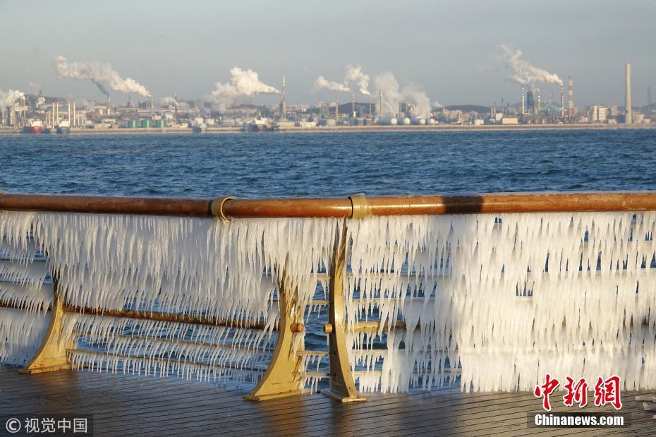 隨著北方持續(xù)低溫,渤海大連海域的海水在潮汐和大風(fēng)的作用下涌上岸邊,在護欄上凝結(jié)成大面積的冰凌景觀。