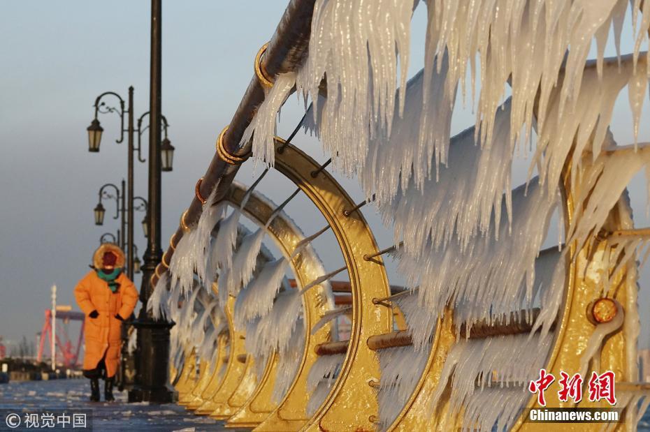 2018年12月29日,大連,晶瑩剔透的冰凌錯落有致的懸掛在東港海岸的木棧道護欄上,美輪美奐,形成了一道“風(fēng)雕冰琢”的風(fēng)景。