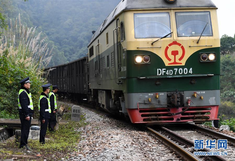 鐵路公安民警陸日峰(左一)和同事目送著一列火車(chē)通過(guò)湘桂線鐵路終點(diǎn)從越南進(jìn)入中國(guó)(2018年12月31日攝)。新華社記者陸波岸攝