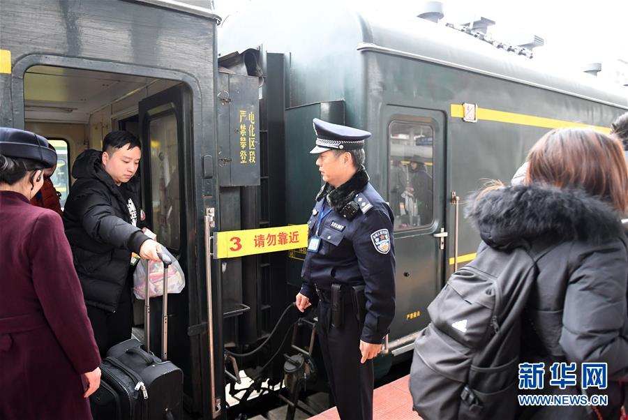 在廣西憑祥火車(chē)站,鐵路公安民警陸日峰(左)和乘警楊鐵鳴交接工作(2018年12月31日攝)。 新華社記者陸波岸攝