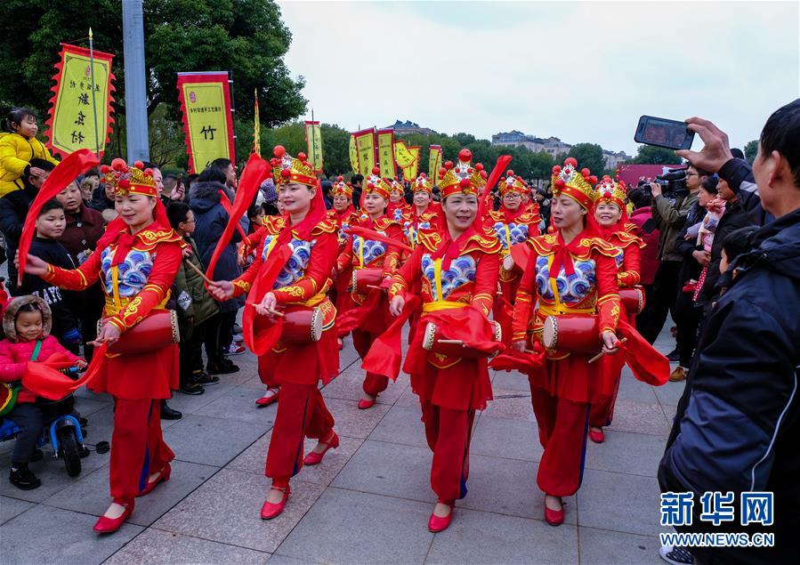 2019年1月1日,演員在展演活動(dòng)上進(jìn)行腰鼓表演。2019年元旦,浙江省桐鄉(xiāng)市濮院鎮(zhèn)舉辦新年“非遺文化藝術(shù)節(jié)”活動(dòng),濮院鎮(zhèn)下屬多個(gè)鄉(xiāng)村的傳統(tǒng)美食制作、手工藝品、非遺文化表演等鄉(xiāng)村特色非遺項(xiàng)目在濮院鎮(zhèn)中心廣場進(jìn)行集中展示展演。新華社記者 徐昱 攝