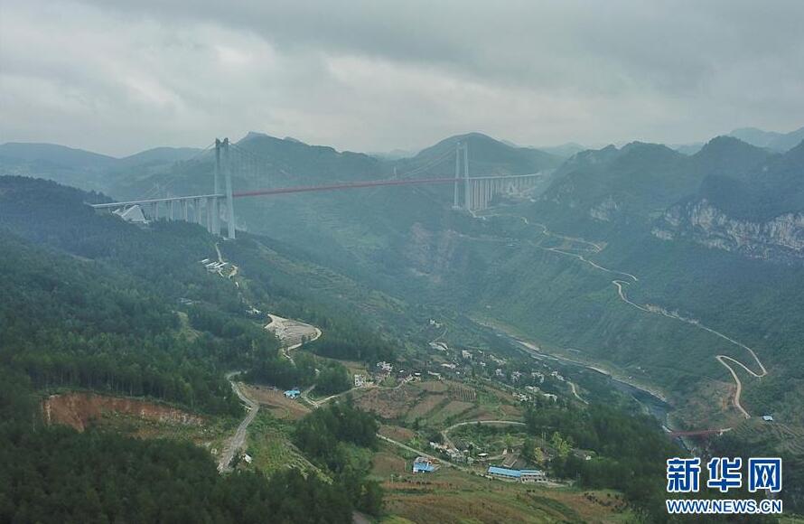 1月7日無人機航拍的平塘特大橋橋塔全景,中為高332米的世界第一高混凝土橋塔。