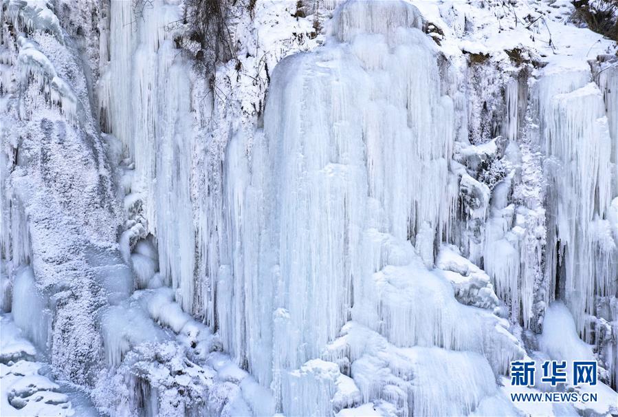 這是在吉林省長白縣十五道溝望天鵝景區(qū)拍攝的冰瀑景觀(1月3日無人機拍攝)。新華社記者許暢攝