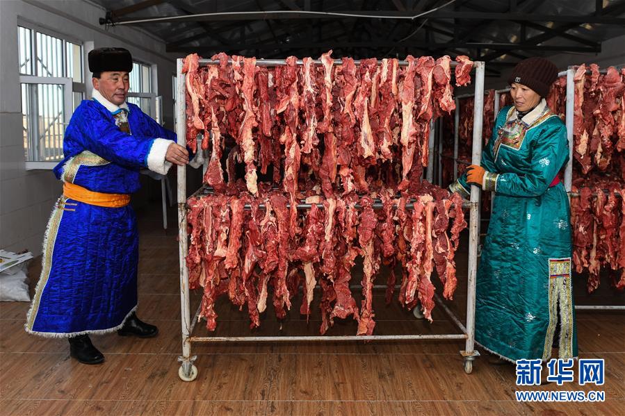 1月9日,牧民伊拉代(左)和妻子斯琴高娃在風干室內(nèi)擺放掛滿牛肉的鐵架。