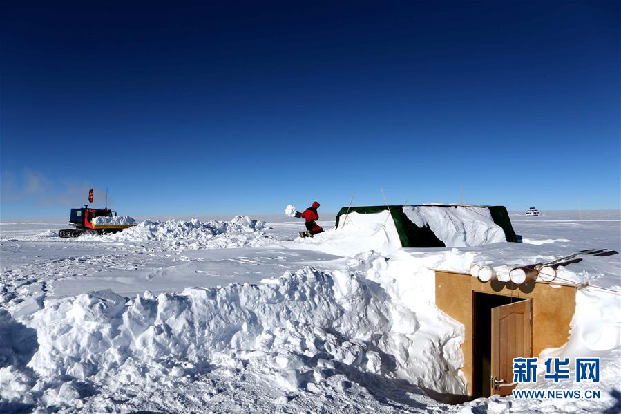 科考隊(duì)員清理深冰芯房周?chē)姆e雪(1月6日攝)。 新華社記者 劉詩(shī)平 攝