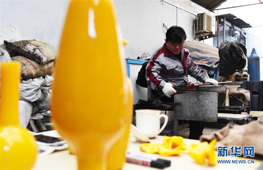 1月12日,孫云毅在吹制雞油黃琉璃藝術(shù)品。