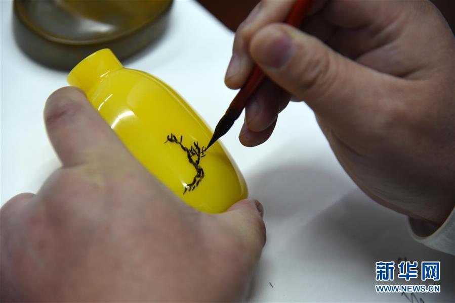 1月12日,孫云毅在為一只雞油黃鼻煙壺作畫(huà)。  新華社記者王凱攝