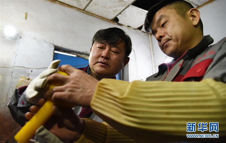 1月12日,孫云毅(左)在和工人交流一只雞油黃琉璃藝術品的打磨工藝。 新華社記者王凱攝