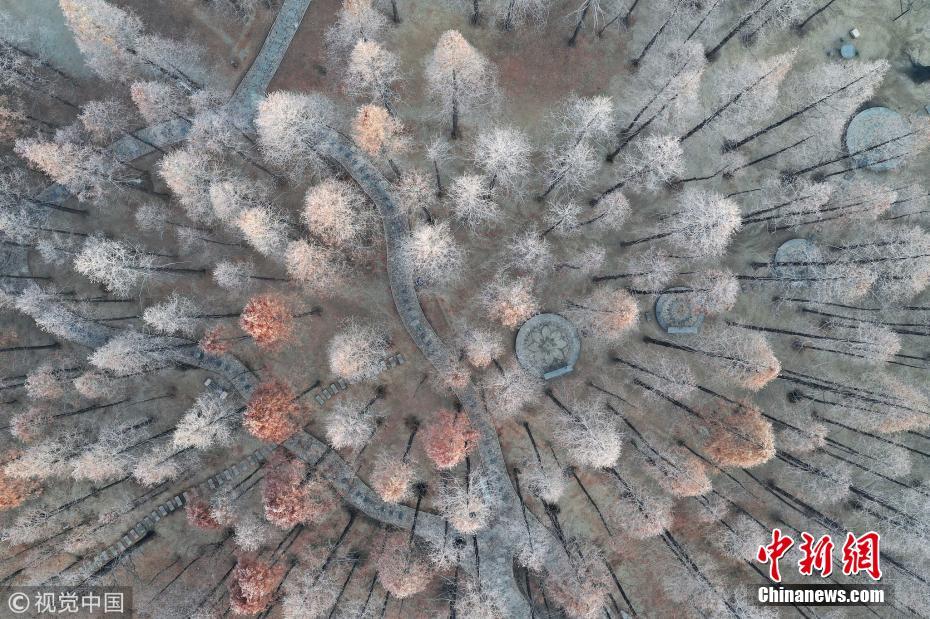 1月13日,霧散日升。河北省邢臺市大街小巷的樹枝上掛滿了潔白晶瑩的霜花,藍天下微風吹拂銀絲閃爍,奇麗壯觀。給臘八節(jié)日增添了亮麗的風景?;艏t軍 攝 圖片來源:視覺中國