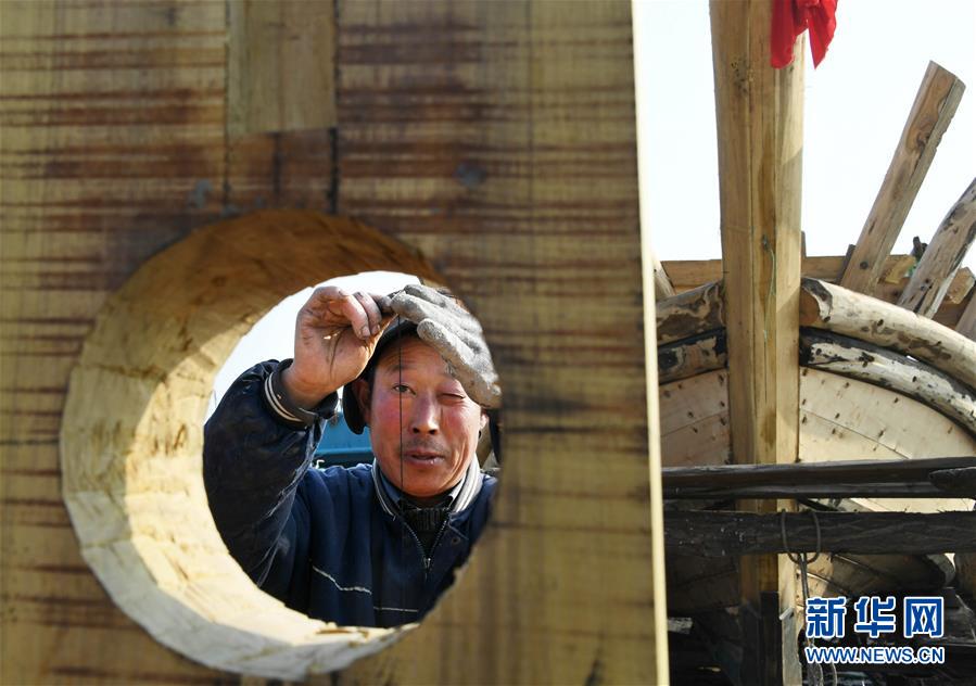 在青島紅雙木造船廠,一位造船師傅在檢查安裝加固龍骨(1月10日攝)。新華社記者 李紫恒 攝
