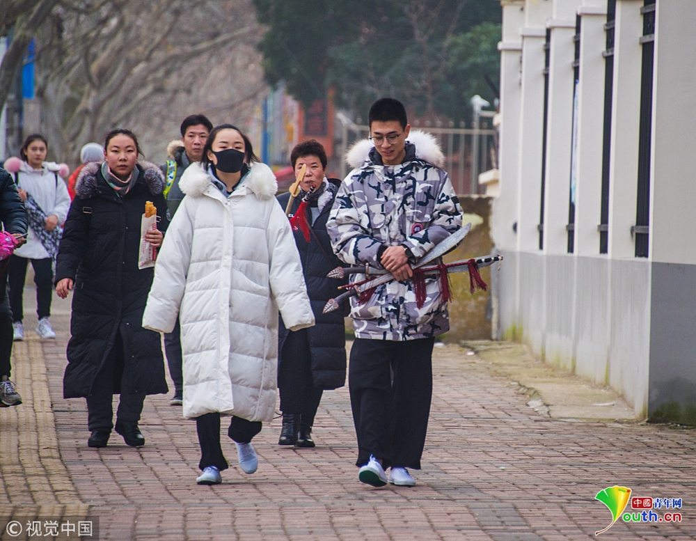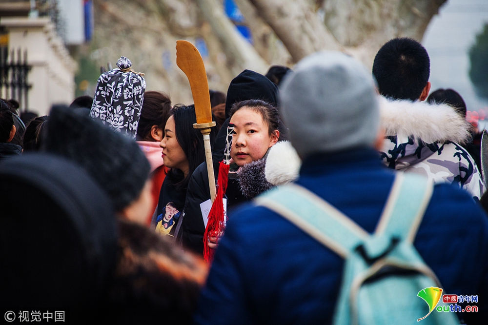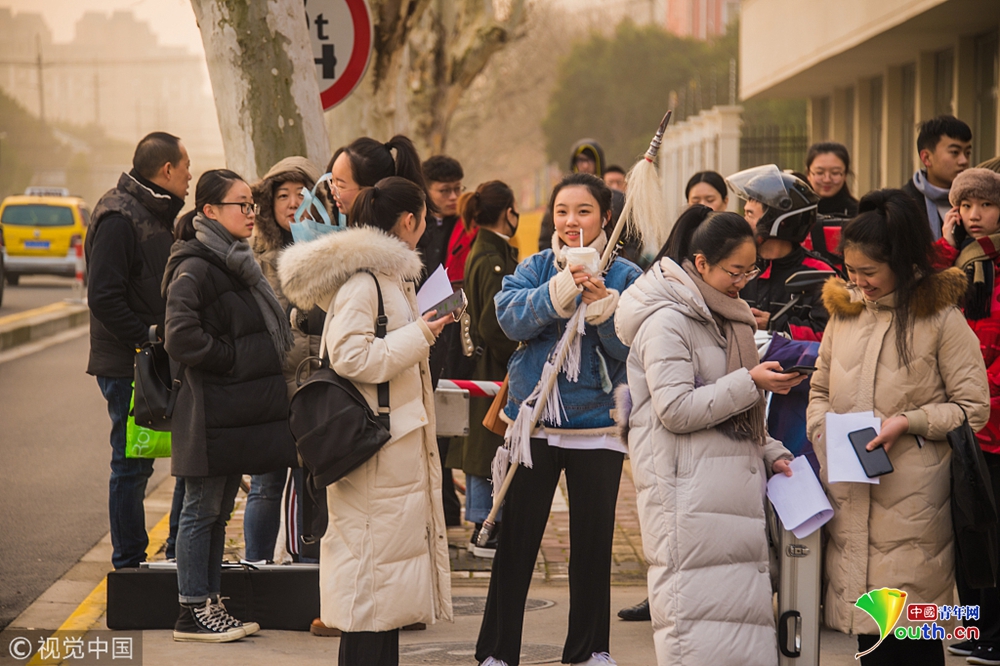2019年1月14日,上海,上戲“藝考”第一階段第一天,不少考生從全國各地趕來,有的帶著樂器,有的帶著“刀槍”,在考點(diǎn)門口候考時,還不時地練習(xí)下。