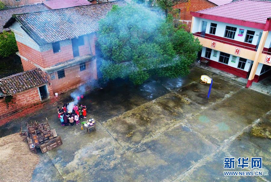 1月3日,章站亮和學(xué)生們一起在學(xué)校內(nèi)燒飯(無人機拍攝)。 新華社記者 胡晨歡 攝