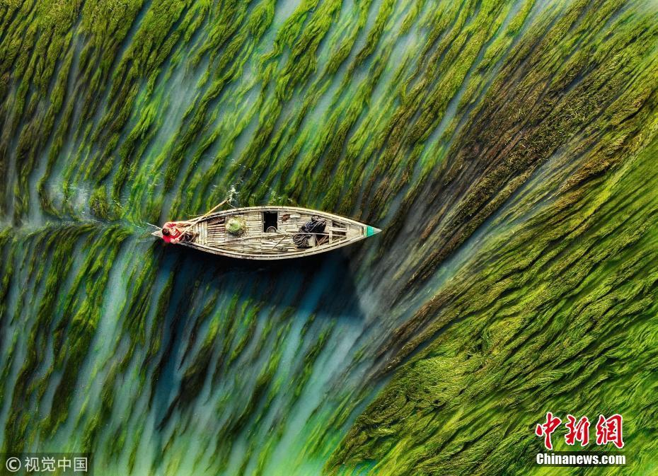 中國新聞網(wǎng)1月14日訊(具體拍攝時間不詳),孟加拉國烏拉帕拉,漁船在水流和藻類的映襯下前行,畫面看起來就像水彩畫一般。圖片來源:視覺中國