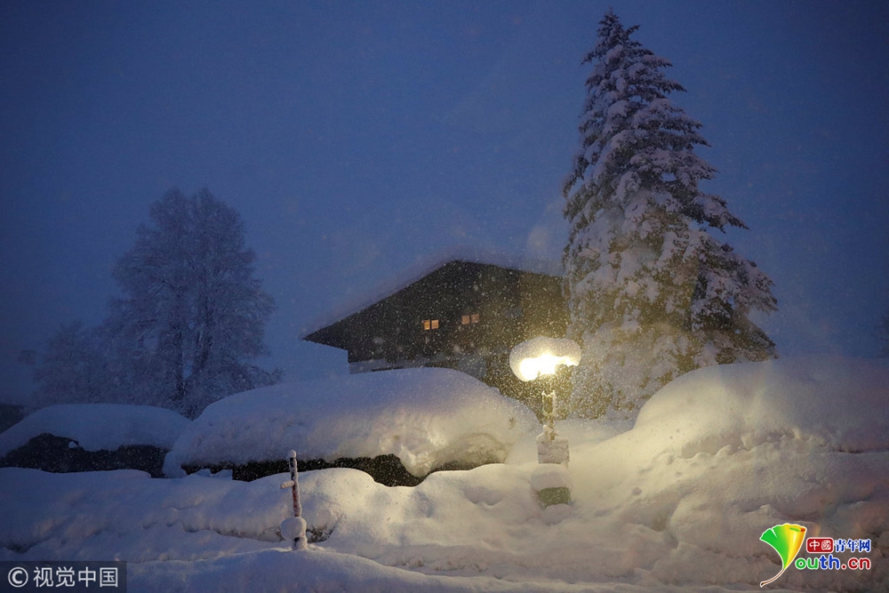 奧地利暴風雪持續(xù) 公交車站被積雪掩埋