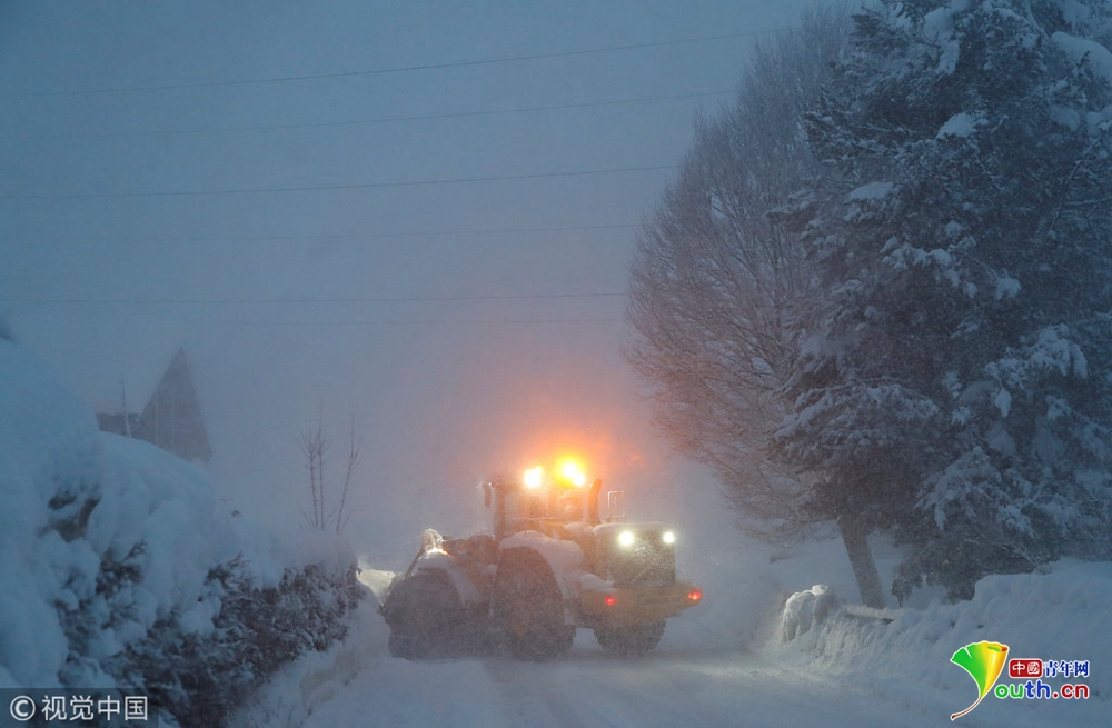 圖為工作人員在清理路面的積雪。