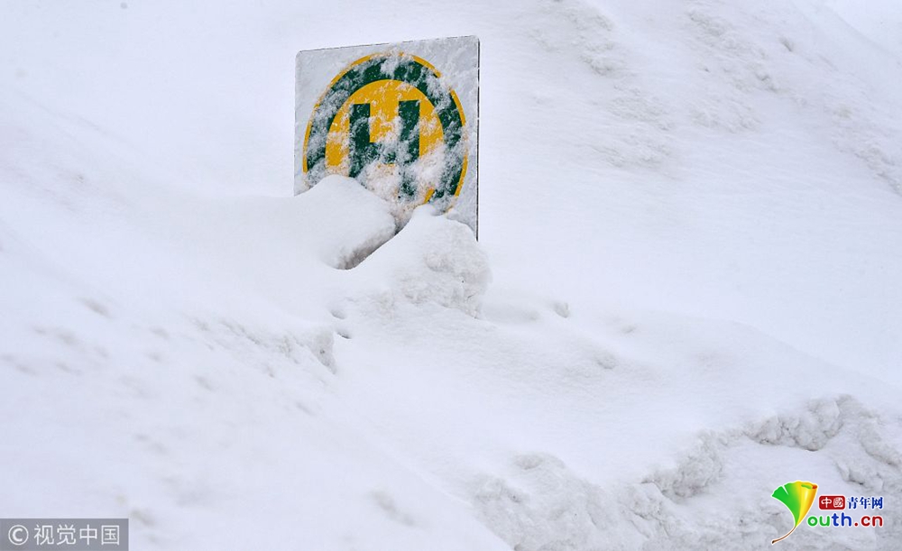 公交車站被積雪掩埋。