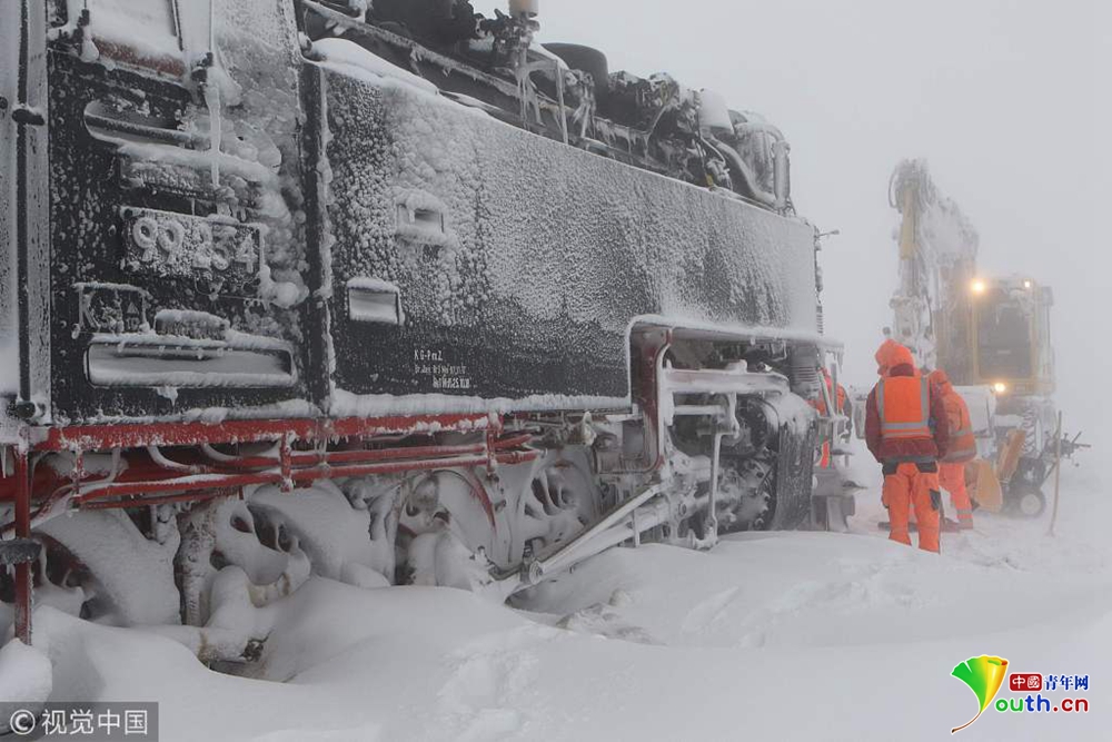 當(dāng)?shù)貢r間2019年1月9日,德國錫爾克,一輛蒸汽火車被大雪困住無法前進(jìn)。