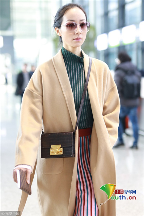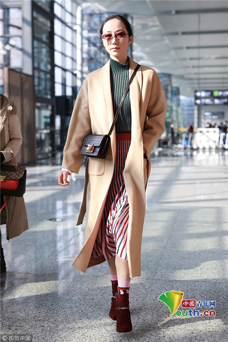 2019年1月17日,上海,韓雪現(xiàn)身機場,穿著條紋紗裙露出小腿,十分抗凍,她搭配經(jīng)典的駝色大衣,氣質出眾在機場人群中相當搶鏡。