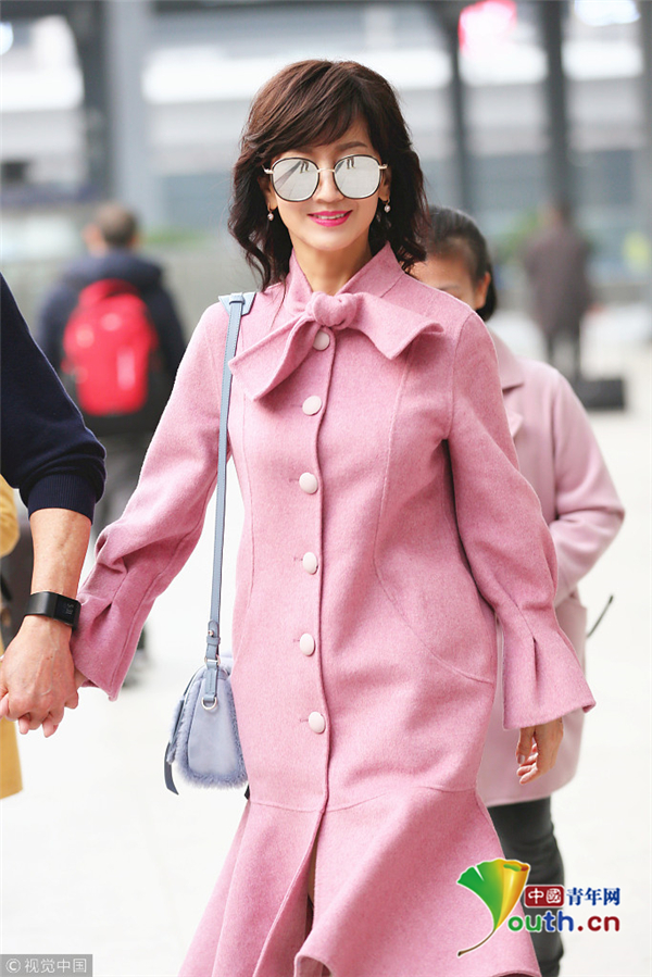 1月22日,廣東深圳,近日,趙雅芝與丈夫黃錦燊現(xiàn)身機(jī)場(chǎng),黑超遮面的她身著粉色昵子魚(yú)尾大衣,氣質(zhì)超群,一路獲粉絲跟隨,共先生黃錦燊牽手同行。
