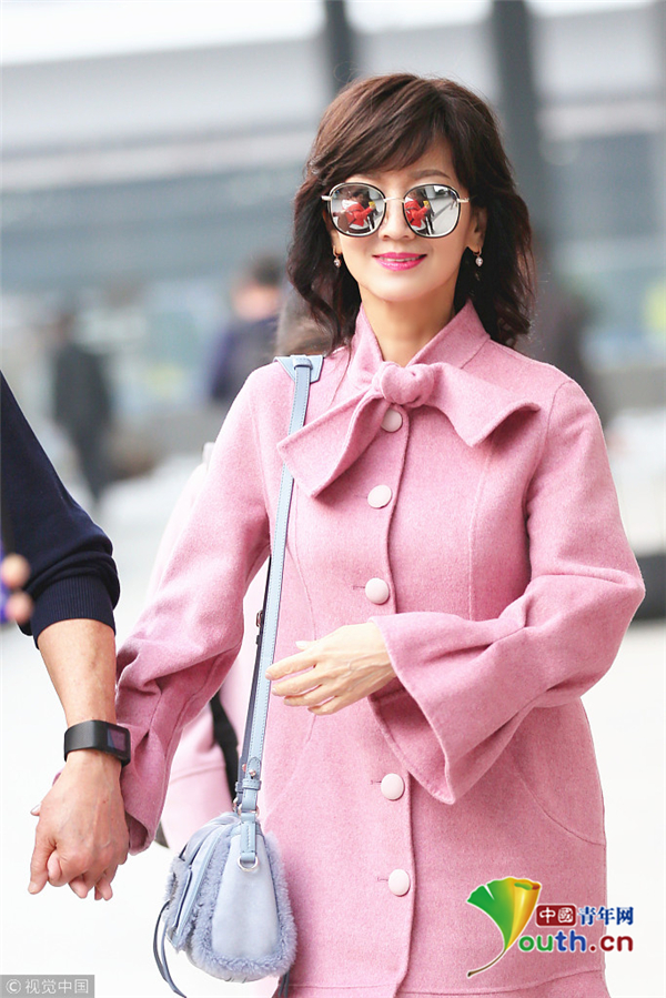 趙雅芝著粉嫩魚(yú)尾大衣優(yōu)雅甜美 獲老公一路牽手