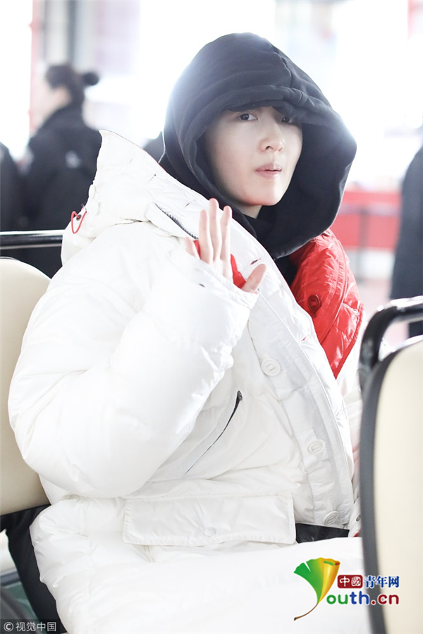 1月23日,北京,周冬雨現(xiàn)身機場。她用黑色連衣帽罩頭襯托巴掌臉,把下巴擱在行李車推桿上的雙手上呆萌可愛 。