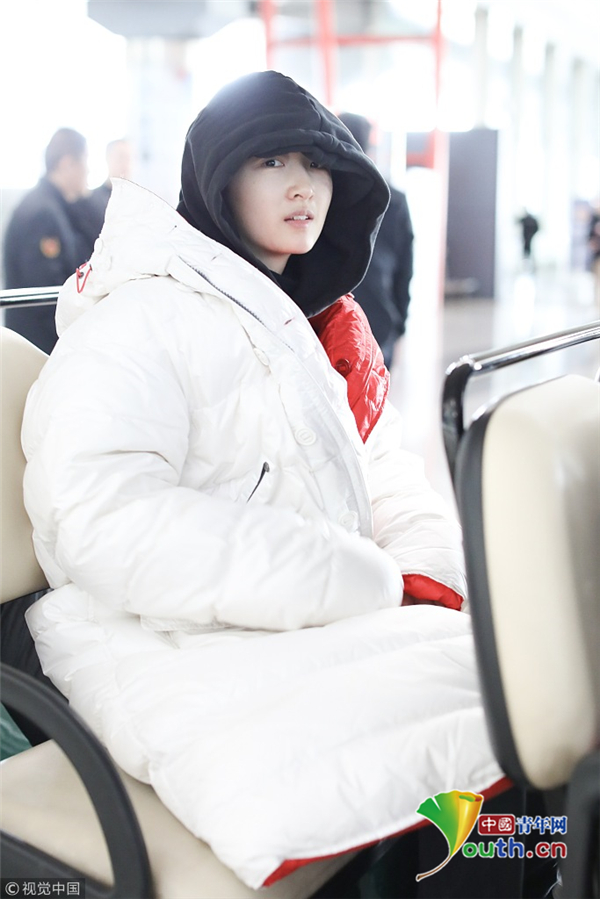 周冬雨連衣帽罩頭襯托小臉 下巴擱在行李車推桿呆萌可愛
