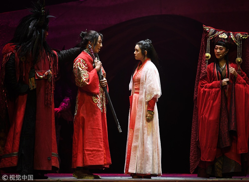 日前,舞臺(tái)劇《大話(huà)西游之大圣娶親》在梅蘭芳大劇院首次公開(kāi)演出。陳妍希飾演“紫霞仙子”靈氣十足。視覺(jué)中國(guó)/圖