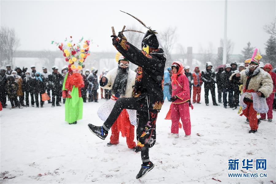 2月16日,社火隊演員在青海省大通回族土族自治縣文化廣場表演。