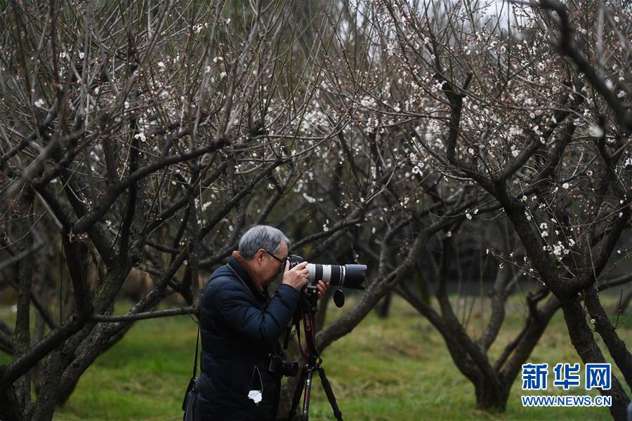 2月17日,攝影愛好者在杭州西溪濕地國(guó)家公園拍攝梅花。