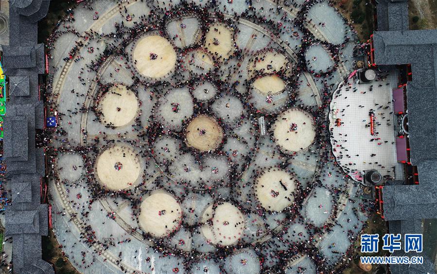 2月24日,在貴州省凱里市舟溪鎮(zhèn),苗族群眾在跳蘆笙舞(無人機拍攝)。 當日,在貴州省黔東南苗族侗族自治州凱里市舟溪鎮(zhèn),來自各地的苗族群眾身著節(jié)日盛裝,歡聚在古老的“甘囊香”蘆笙堂,男子吹奏起蘆笙,姑娘和孩子們跳起蘆笙舞,歡度新春,祈求風調(diào)雨順、五谷豐登,青年男女也借此良日尋覓意中人。 “甘囊香”是苗語音譯,意思為“河流的下游,神仙匯聚的地方”。“甘囊香”蘆笙會是貴州規(guī)模最大、最古樸的苗族蘆笙會之一。 新華社記者楊文斌攝