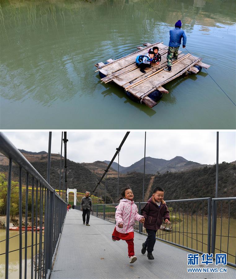 這是一張拼版照片:上圖為略陽(yáng)縣徐家坪鎮(zhèn)藥木院村江口壩組的余皓軒(左)、劉紫涵(中),由余皓軒的外公劉德安撐上簡(jiǎn)易木筏,去對(duì)岸的幼兒園上學(xué)(2018年11月22日無(wú)人機(jī)拍攝);下圖為余皓軒(前右)、劉紫涵(前左)放學(xué)歸來(lái),手拉手走在新修的鋼結(jié)構(gòu)吊橋上(2019年3月25日攝)。