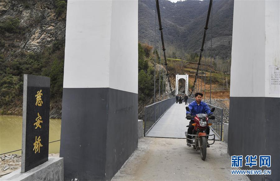 3月25日,略陽(yáng)縣徐家坪鎮(zhèn)藥木院村村民騎著摩托車(chē)行駛在新修的鋼結(jié)構(gòu)吊橋上。 新華社記者陶明攝