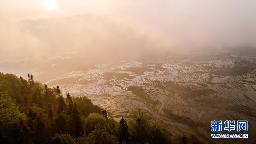 這是在云南省元陽縣拍攝的晨曦中的哈尼梯田美景(4月4日無人機拍攝)。哈尼梯田位于云南省哀牢山南部,以哈尼族為主的當?shù)厝罕娗О倌陙砩幌⒃诖蟮厣稀暗窨獭背鲞@一農(nóng)耕文明奇觀。春日里,漫山的水稻梯田與云海、森林、村莊形成一幅美麗的畫卷,吸引眾多海內(nèi)外游客前來觀賞。新華社記者 胡超 攝