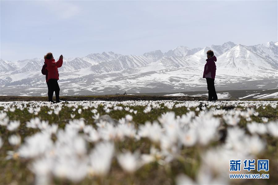 4月4日,游客在新疆那拉提景區(qū)雪山腳下拍攝盛開(kāi)的野百合。