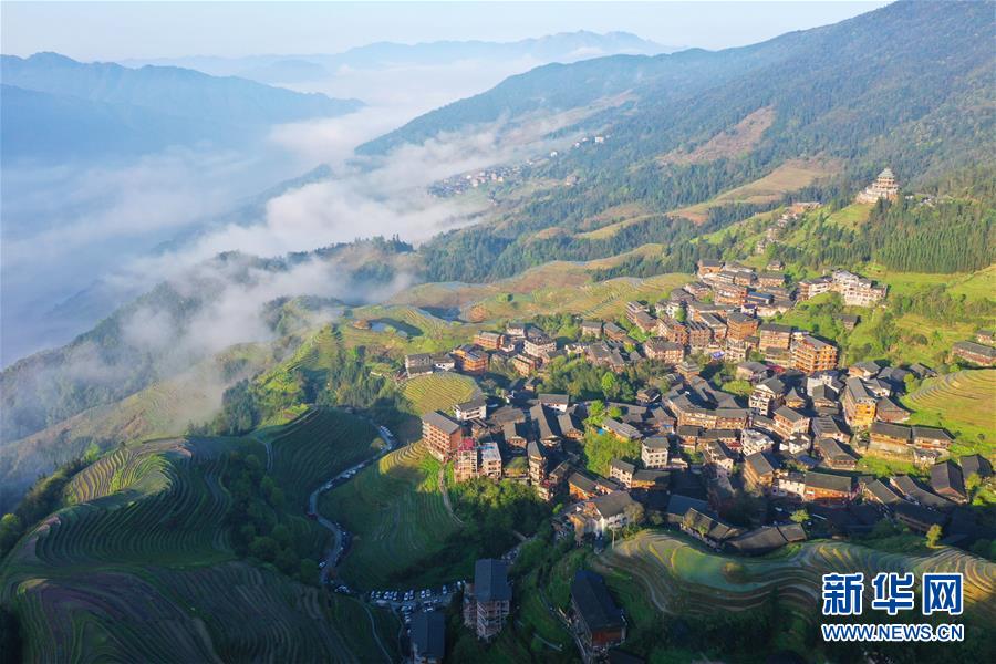 龍勝各族自治縣和平鄉(xiāng)平安村一景(4月7日攝)。連日降雨過(guò)后,廣西龍勝各族自治縣和平鄉(xiāng)平安村的壯族村寨迎來(lái)久違的朝陽(yáng)。 新華社記者 曹祎銘 攝