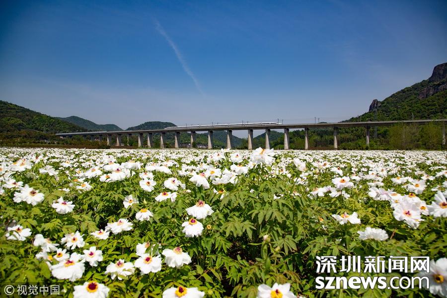 2019年4月8日,一列高鐵列車從京福高鐵安徽銅陵段一片盛開的鳳丹花海中駛過。隨著氣溫回升,安徽省銅陵市境內(nèi)的鳳丹競相綻放,高鐵列車穿行其間,成為春日里一道美麗的風(fēng)景線。
