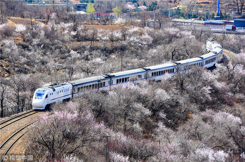 2019年3月22日,北京居庸關(guān)附近的山花盛開,S2線列車穿行在花海之中,構(gòu)成一幅美麗的畫面。時永平/千龍圖像/視覺中國 編輯/陳進(jìn)