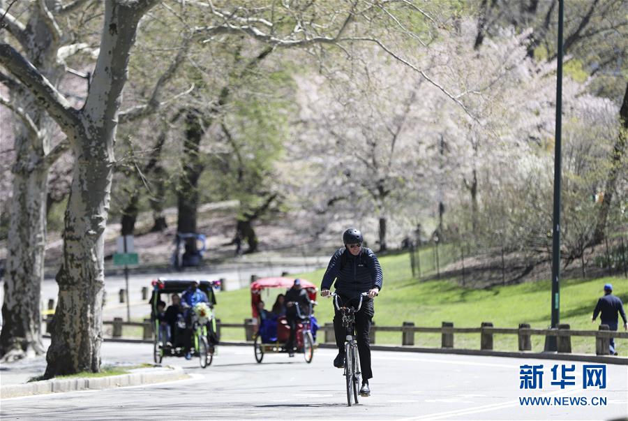 4月16日,人們?cè)诿绹?guó)紐約中央公園騎行。 新華社記者 王迎 攝