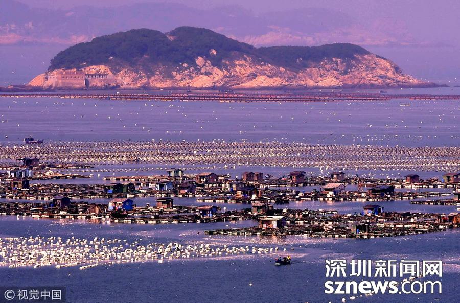2018年10月26日,在福建連江海域上,“海上田園”網(wǎng)箱羅列,漁排上搭建的木屋錯落成“戶”,蔚為壯觀,成為一道獨(dú)特的風(fēng)景線。福建省連江縣是中國鮑魚養(yǎng)殖第一大縣。