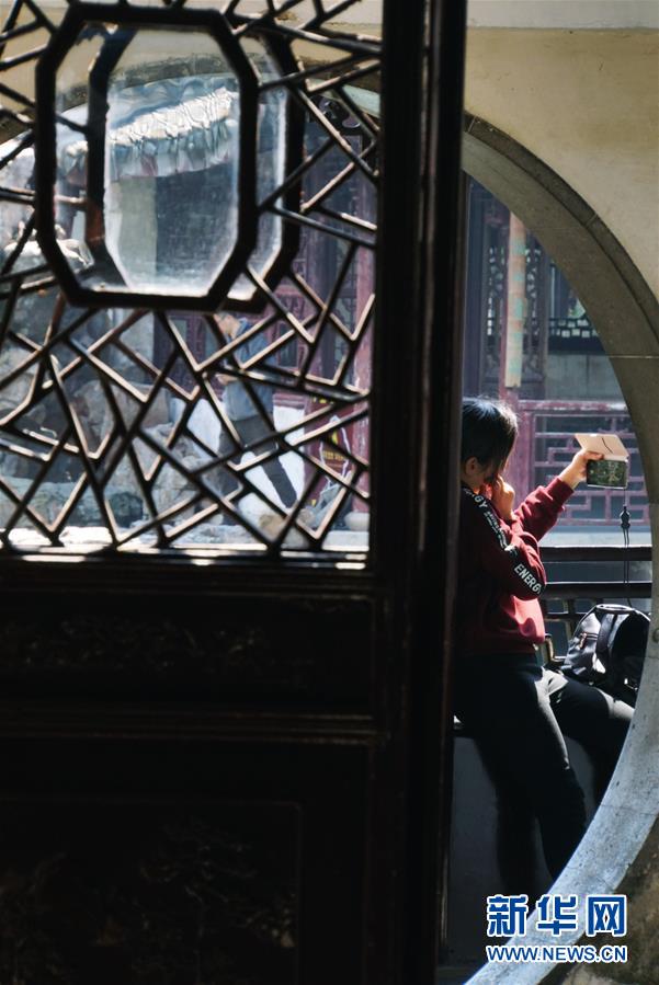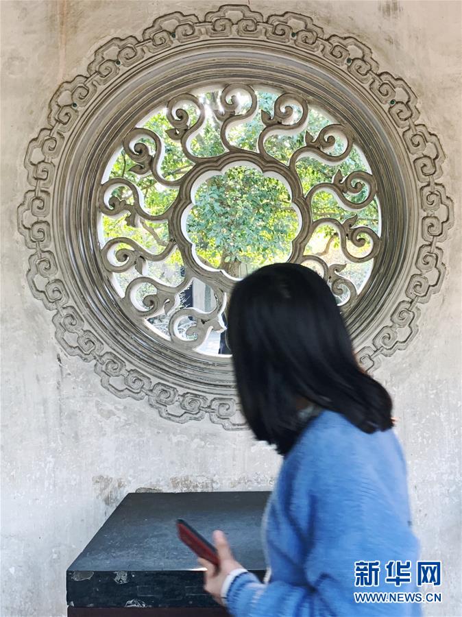 2019年4月1日,一名游客在中國蘇州耦園內(nèi)拍照。2000年,耦園和滄浪亭、藝圃、獅子林、退思園作為蘇州古典園林的擴展項目被列入聯(lián)合國教科文組織世界文化遺產(chǎn)名單。 新華社記者杜涓涓攝