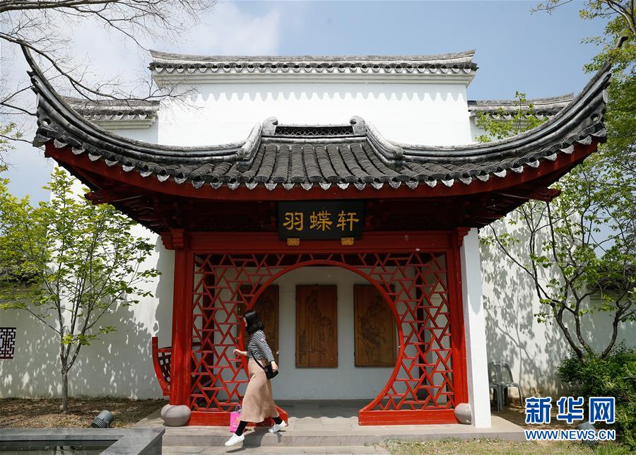 2019年4月20日,游客在韓國順天灣國家園林里的中國寧波園羽蝶軒前游玩。位于順天灣國家園林世界園林展區(qū)的中國寧波園以梁山伯與祝英臺的凄美愛情故事為主題,利用水、橋、石頭和樹木等為游客呈現(xiàn)極具中國特色的園林景觀。 新華社記者王婧嬙攝