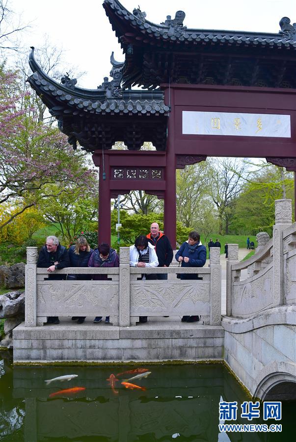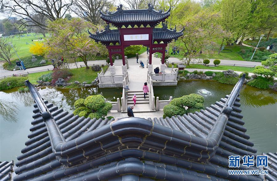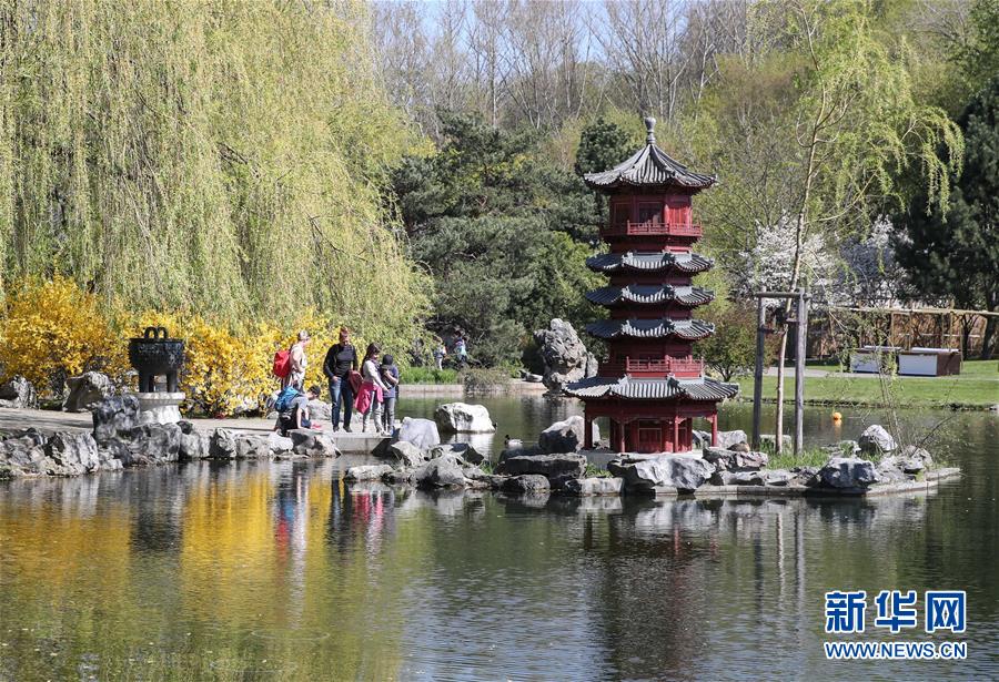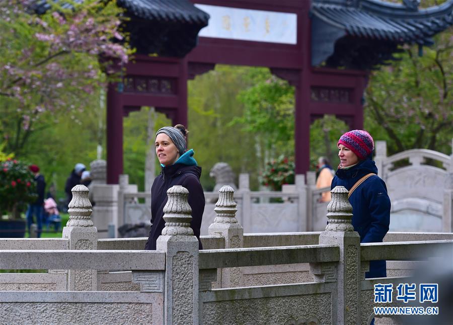 2019年4月13日,在德國曼海姆,游客在中式園林“多景園”內(nèi)游玩?!岸嗑皥@”位于曼海姆市路易森公園內(nèi),占地約6000平方米,建筑面積約1500平方米,是目前歐洲最為完整的中國古典園林建筑群落之一。 新華社記者逯陽攝