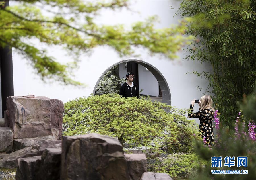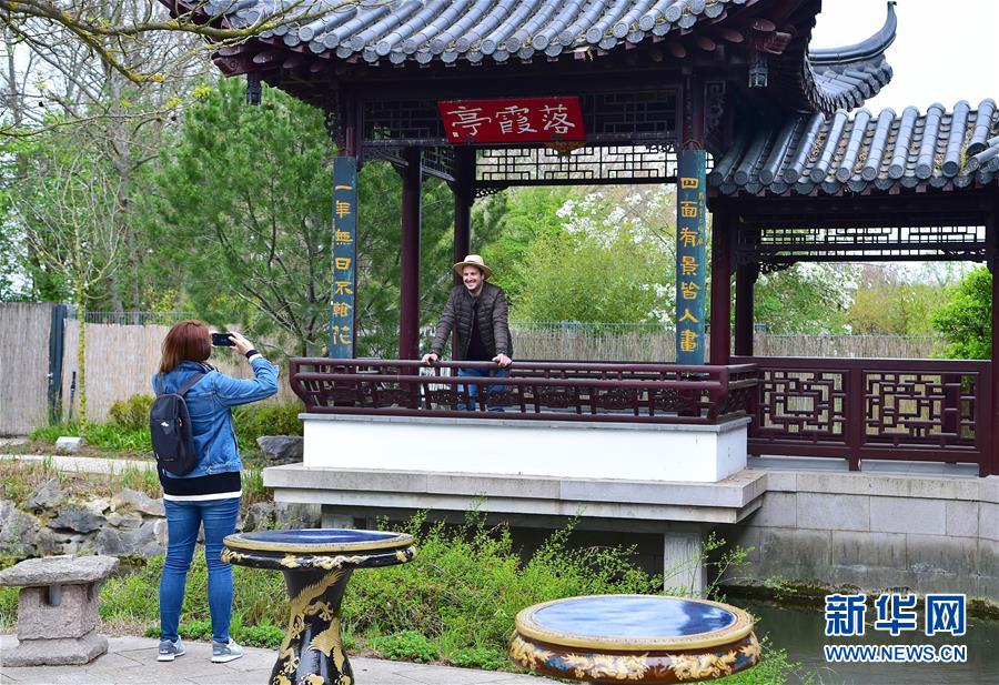 2019年4月13日,在德國曼海姆,游客在中式園林“多景園”內(nèi)拍照?!岸嗑皥@”位于曼海姆市路易森公園內(nèi),占地約6000平方米,建筑面積約1500平方米,是目前歐洲最為完整的中國古典園林建筑群落之一。 新華社記者逯陽攝