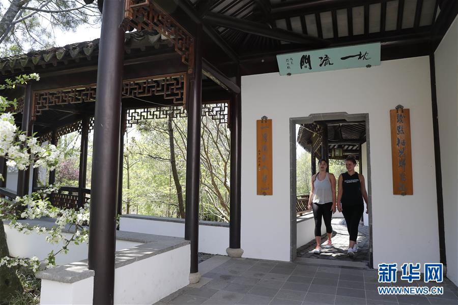 2017年4月28日,游客在美國紐約寄興園內(nèi)游覽。仿照中國蘇州園林設(shè)計建造的寄興園位于紐約斯塔滕島,占地面積約4000平方米,其所用的建筑材料大都在蘇州加工制造,并由40名來自蘇州的藝術(shù)家和工匠歷時6個月在紐約修建而成。 新華社記者王迎攝